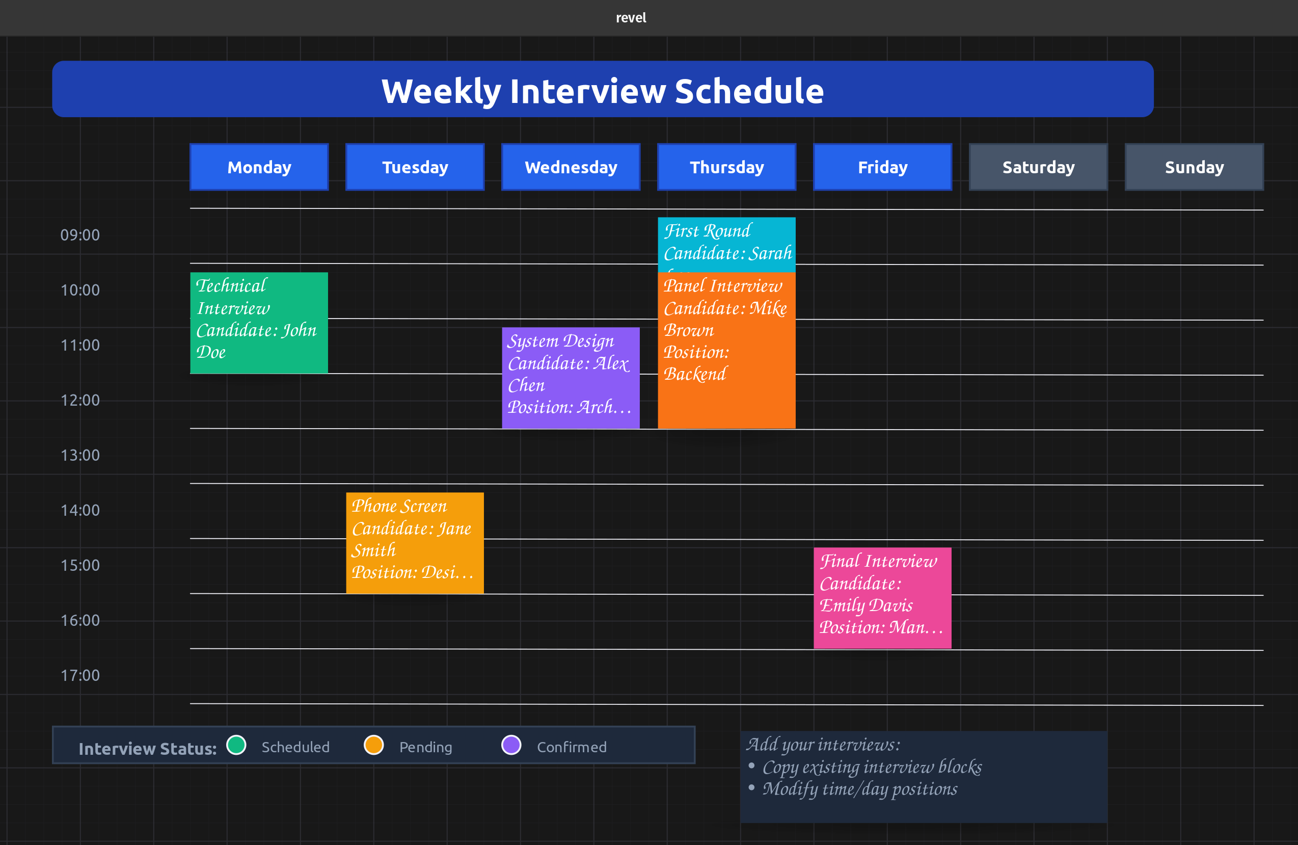 The calendar includes hourly time slots from 9am-5pm, and you can easily add interview slots by copying the example blocks and adjusting positions. Each interview card can hold candidate details, position info, and be color-coded by status. It’s a practical example of how the DSL can be used for everyday productivity tools, not just technical visualizations.