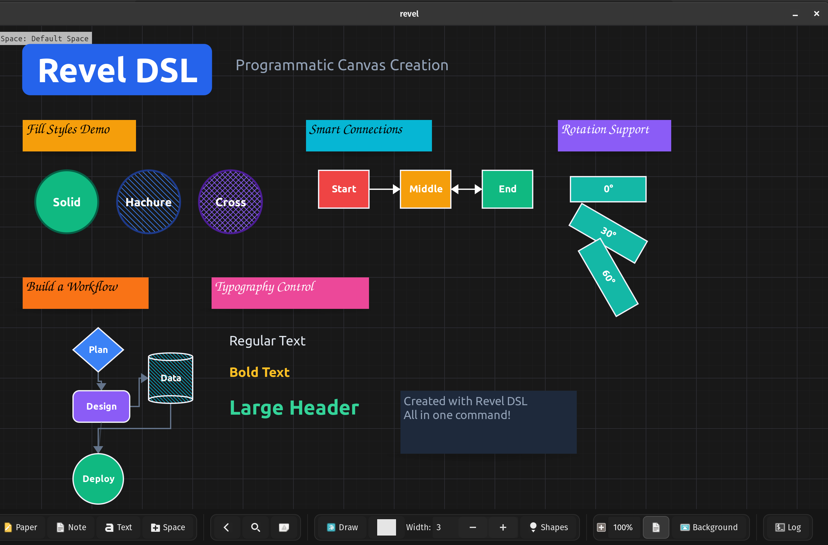 One feature I’m particularly proud of is Revel’s DSL (Domain Specific Language). It lets you programmatically create entire canvas layouts with a simple text script. Think of it as “Infrastructure as Code” but for visual brainstorming.