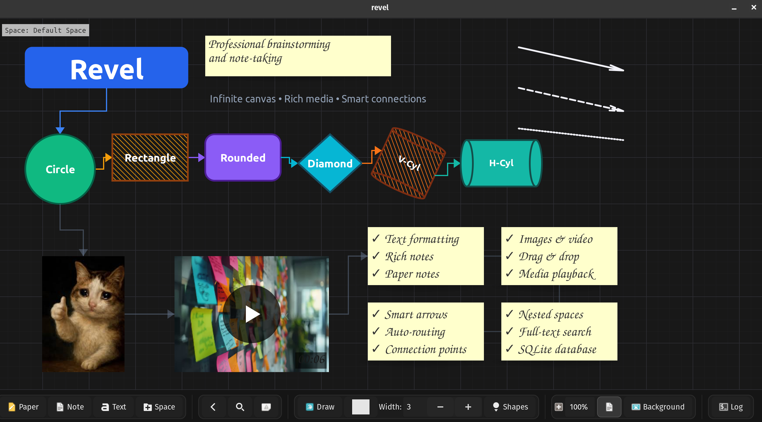 Revel supports multiple element types including shapes (circle, rectangle, rounded rectangle, diamond, vertical cylinder, horizontal cylinder, arrow, line, triangle), text elements, notes, paper notes, spaces, images, and videos.